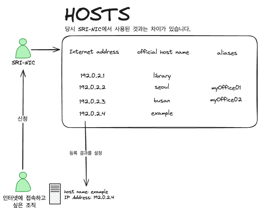 IP 주소는 인터넷 전체에서 고유한 번호여야 하므로 어느 기기가 어느 IP주소를 사용 중인지 통일성 있게 관리해야 합니다. 그렇기에 HOSTS파일은 이름이나 번호가 중복되지 않도록 SRI-NIC(Stanford Research Institue Network Information Center)에서 일원화 관리를 했습니다. 이처럼 인터넷에서 공통으로 사용되는 이름이나 번호를 일원화 관리하는 조직을 **레지스트리(registry)**라고 합니다.