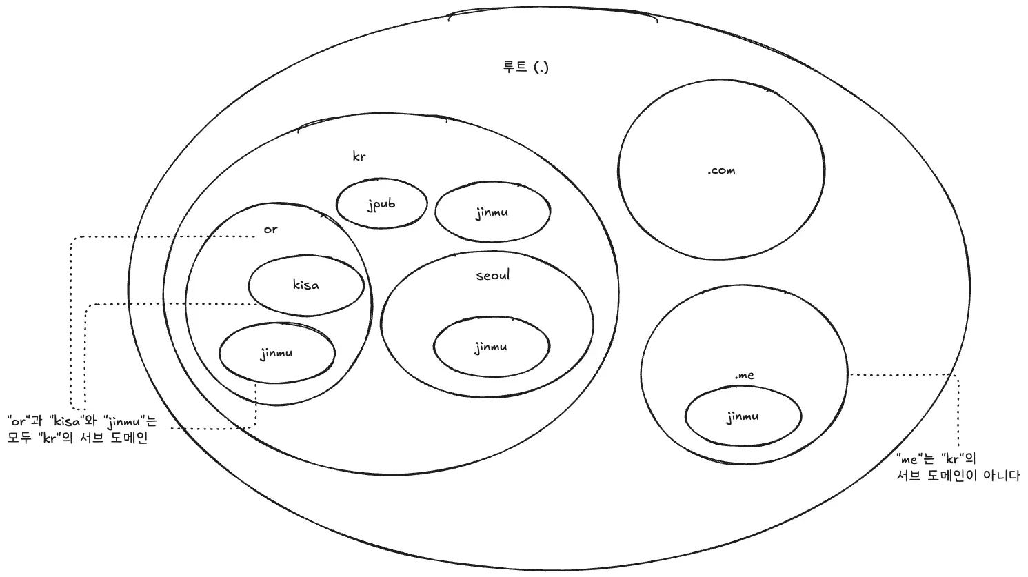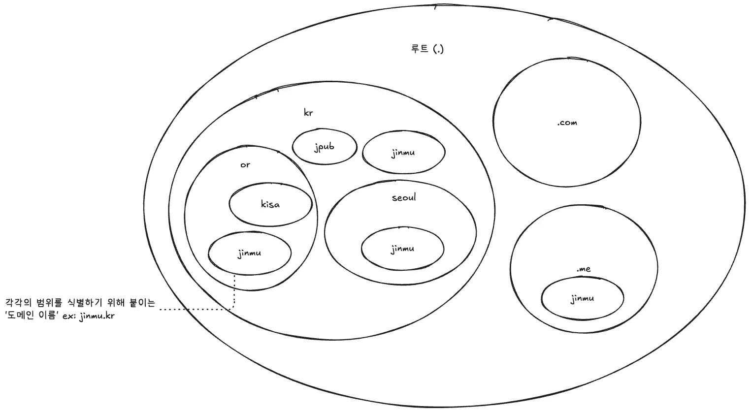 인터넷에서는 분할된 각 네임 스페이스의 범위를 도메인(domain), 그 범위를 식별하기 위해 붙여진 이름을 **도메인 이름(domain name)**이라고 부릅니다.