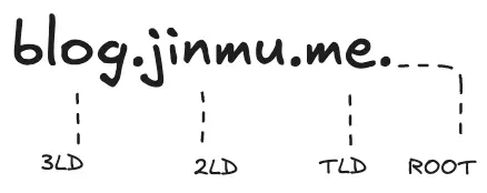 도메인 이름은 문자열을 ’.(dot)‘으로 연결한 형태로 구성됩니다. 각각의 문자열을 라벨(label) 이라고 합니다. 사실, 도메인 이름의 마지막에도 점(.)이 붙어있는데 보통은 생략합니다. 도메인 이름의 마지막에 붙여진 점은 계층 구조의 정점인 루트(root) 를 나타내며, 루트를 기준으로 오른쪽에서 순서대로 다음과 같이 부릅니다.