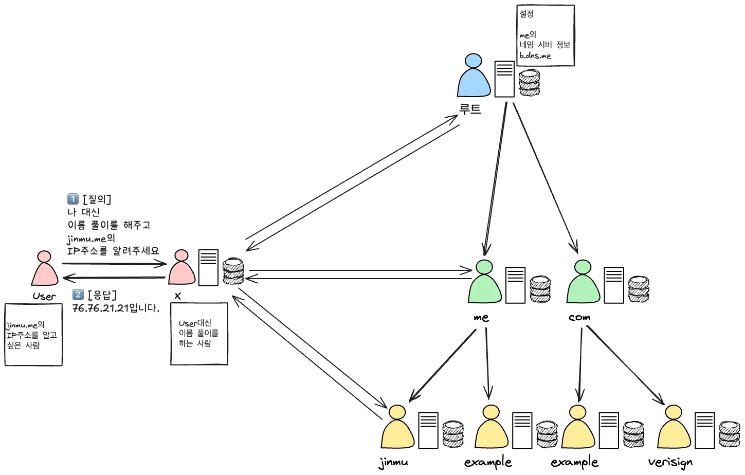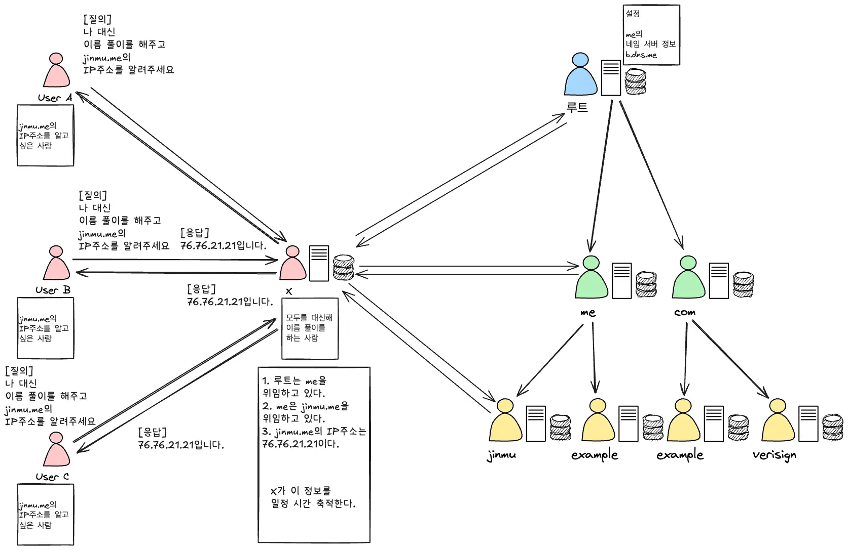 예시에서 User대신에 이름 풀이를 해주는 대행자를 X라 하겠습니다. 이때 User는 X에게 ‘나 대신 이름 풀이를 해주고 jinmu.me의 IP주소를 알려주세요’라는 질의를 보내며, 위에서 설명한 이름 풀이는 X가 대행하게 됩니다.