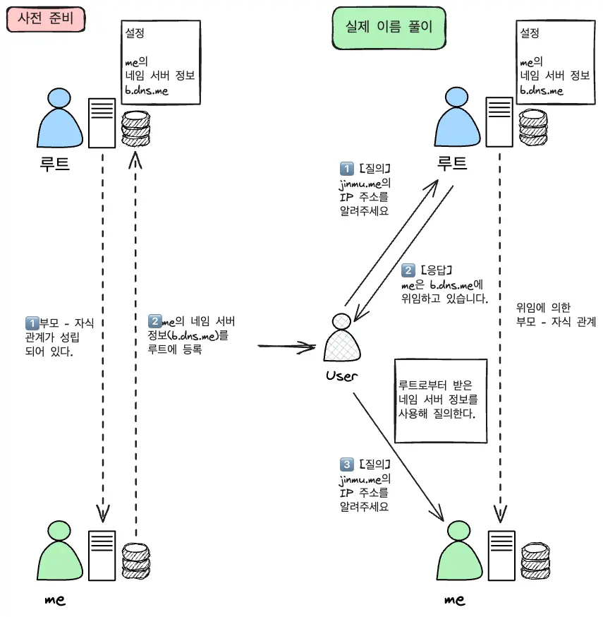 루트와me사이엔 위임에 의한 부모-자식 관계가 성립되어 있다. 루트가 부모,me가 자식이 된다.me은부모인 루트에게 자신의 네임 서버 정보를 등록한다.루트는me이 등록한 네임 서버 정보를 자신의 네임 서버에 등록 및 설정한다.