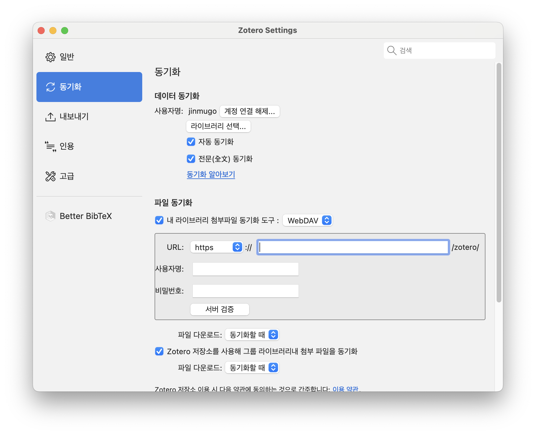 Zotero의 설정 창에 들어가 동기화 탭에 들어가면 파일 동기화 부분이 있습니다. 여기에서 동기화 도구를 WebDAV로 바꿔주고 폼을 입력해 줍니다.