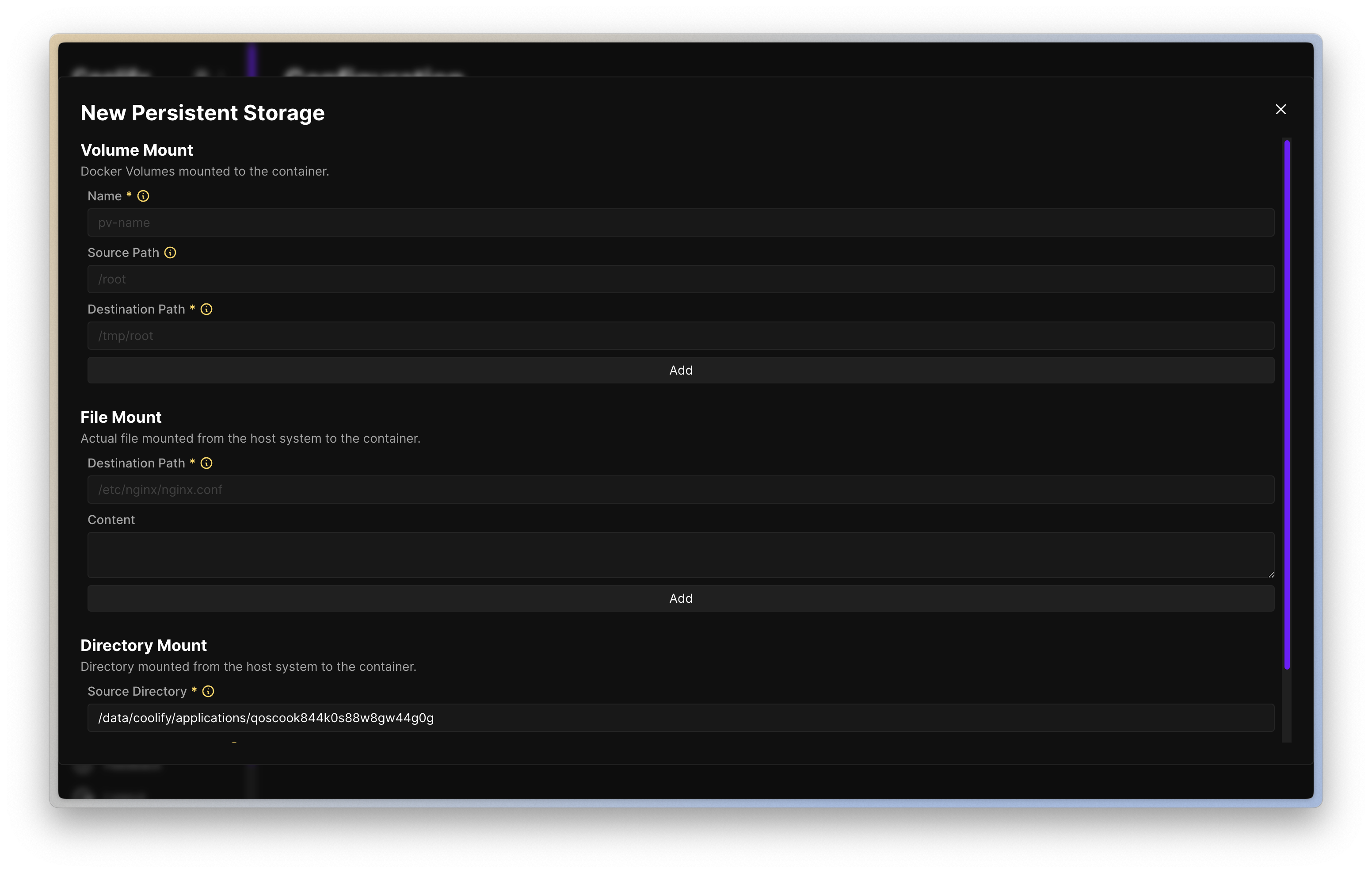 bind mount 설정은 Persistant Storage Tab에서 할 수 있습니다.